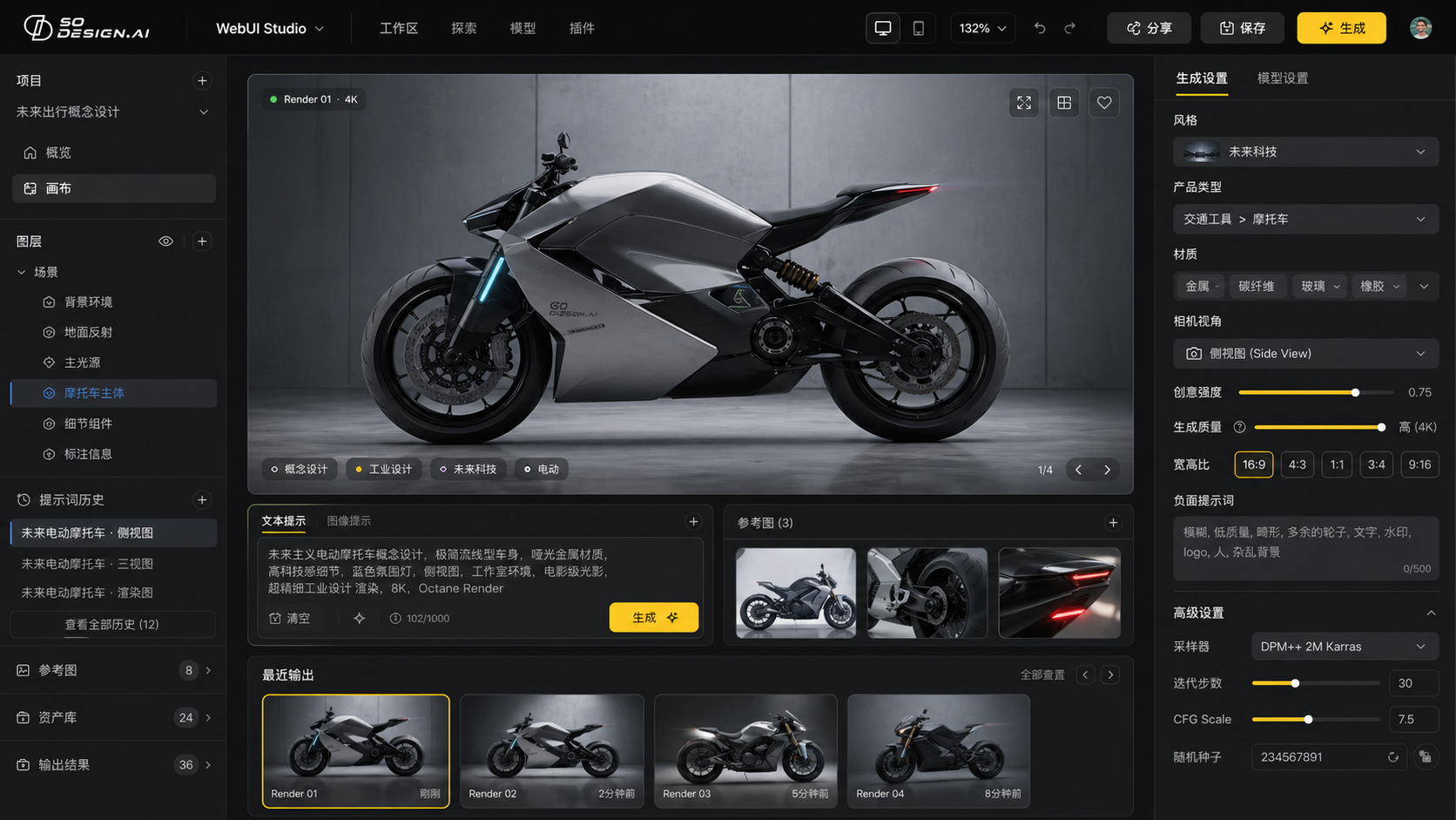 通过文本描述或意向图示意,快速生成可视化设计方案。专业的工业设计提示词引擎,精准输出高质量渲染效果。